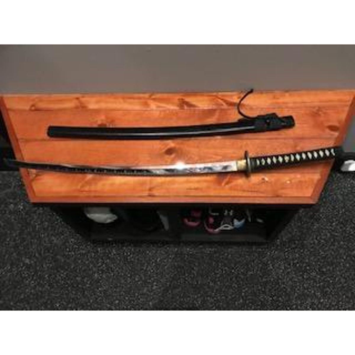 Reproduction Japanese Katana with 1045 carbon steel blade, painted wooden scabbard & wrapped with traditional sharkskin grips. A very nice example of a higher-end replica Katana replica. #1017MS Â
