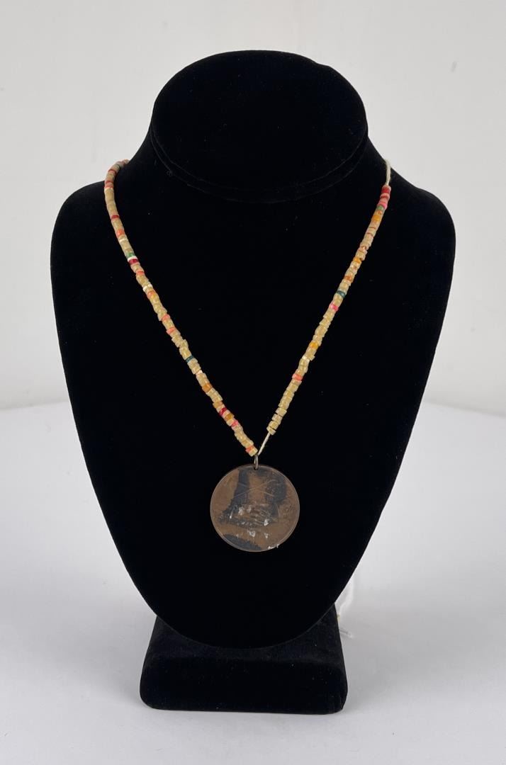 Nice old heishi beads. 1801 Jefferson Medal appears to be a reproduction. Allard Auction Collection Inv: BJP 28556