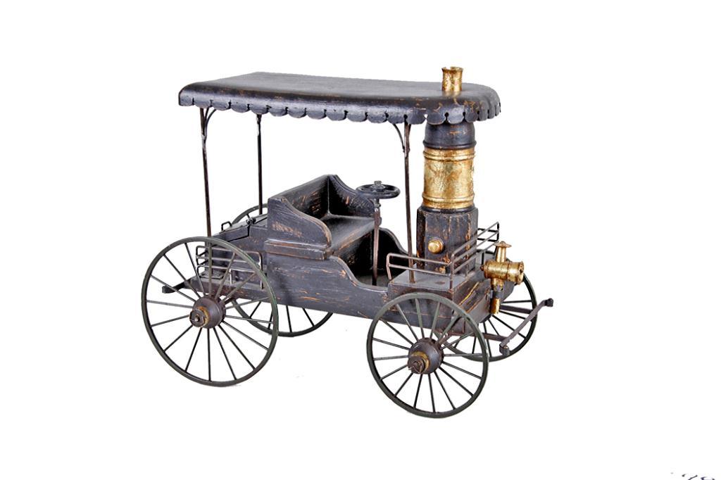 Reproduction Model of a "Horseless Carriage" Stanley Steamer motor wood burning steam driven carriage reportedly to have been build by a Minnesota blacksmith in 1902. A classic wooden and metal constructed steam motor car with brass boiler, iron spoke whStanley Steamer motor wood burning steam driven carriage reportedly to have been build by a Minnesota blacksmith in 1902. A classic wooden and metal constructed steam motor car with brass boiler, iron spoke wheels, covered "surrey" top,front seat, wood storage bin and iron bumpers. This unique crafted model of an early motor car measures 17 3/4"Hx21 1/4"Lx12"W. The four metal wheels are 6 1/2" in diameter. The screws have been replaced and some repairs have been made.