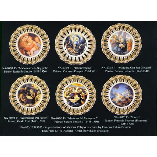 Capodimonte Porcelain "Reproduction Religious" Plates Complete Set. A total of 6 plates. Plate reproduction by various famous Italian painters. Each plate is 12" in diameter. Satisfaction Guaranteed All our capodimonte pieces are 100% authentic, made with the best craftmanship in Italy. Capodimonte is more than a century Italian style of the finest porcelain once reserved for kings and queens. The style became popular when the royal family in Italy fell in love with the beauty of Capodimonte arts. The selection you see is made by artisans, according to the same tradition dating back to the 18th Century.<BR>Free Shipping in the continental US
