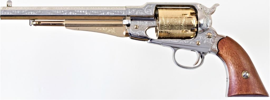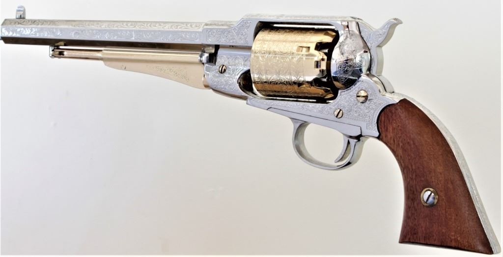 Reproduction Remington Army .44 cal. percussion revolver made by ASM Italy with 8" barrel chrome and gold finish laser engraved in scroll pattern. Near new condition appears unfired and includes extra set of grips. NO FFL. From old St. Louis Collection.percussion revolver made by ASM Italy with 8" barrel chrome and gold finish laser engraved in scroll pattern. Near new condition appears unfired and includes extra set of grips. NO FFL. From old St. Louis Collection. Est. 125-200