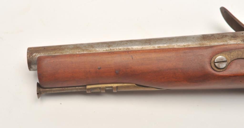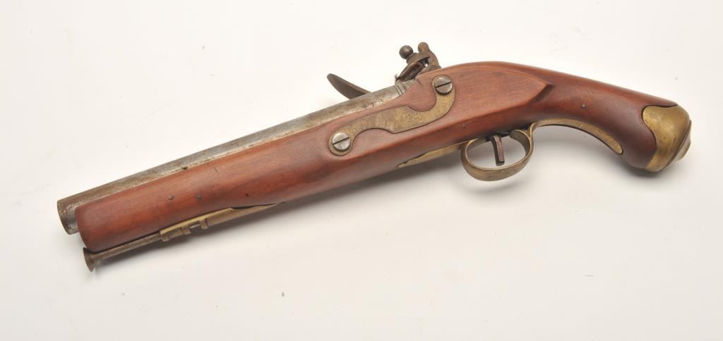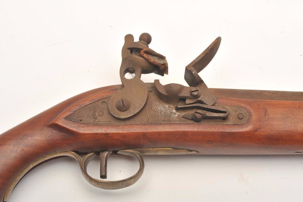 Reproduction Tower F/L pistol, approximately .70 caliber, Serial #618. The pistol is in good overall condition with a 9” barrel. The barrel and lock shows moderate surface rust with Tower and the GB noted on the lockplate. The smooth wood stock is in good condition with brass hardware. Est.: $25-$50.