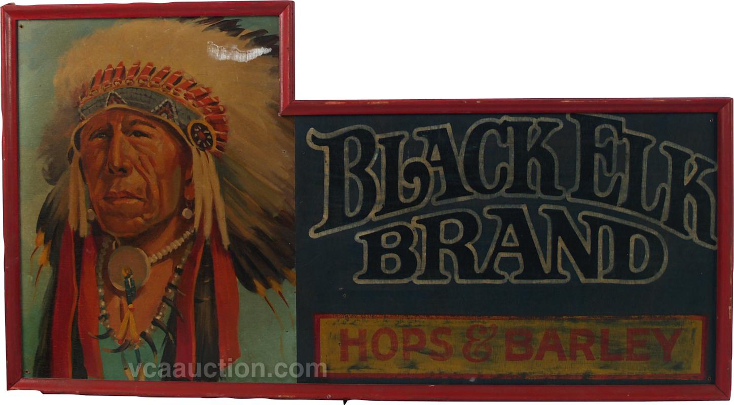 Reproduction Wooden Sign "Black Elk Brand - Hops & Barley" w/ indian chief picture, made for the Claim Jumper restaurant - 49" x 26"