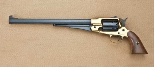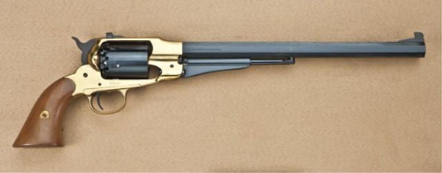 Reproduction blackpowder .44 caliber percussion revolver, based on 58 Remington design, except cast brass frame. 12” octagon barrel, target sights, made by F. Lipietta, Italy. Fine to excellent condition in box. Shows no evidence of firing, but slight index line on cylinder. Est: $200 - $400