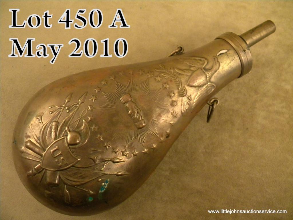 Reproduction brass “Peace” style flask, approx. 9” x 4” in overall good condition with hanging rings and simple spout. Good for display. Est.: $15-$30.