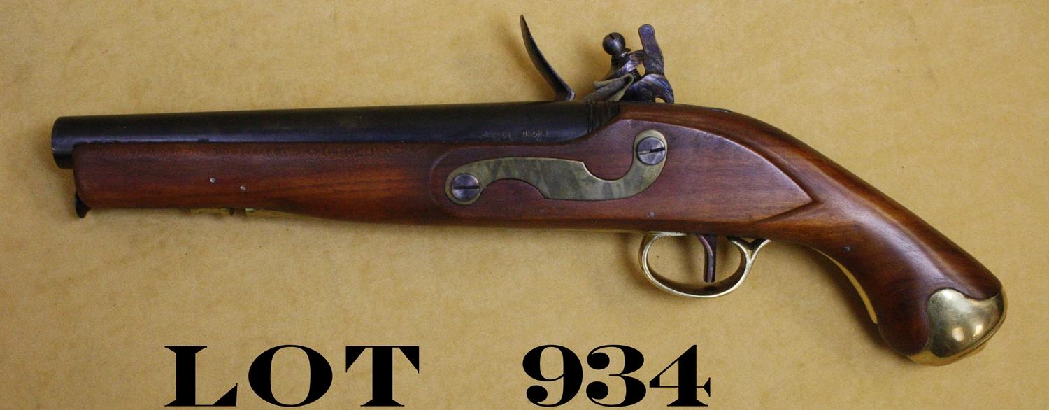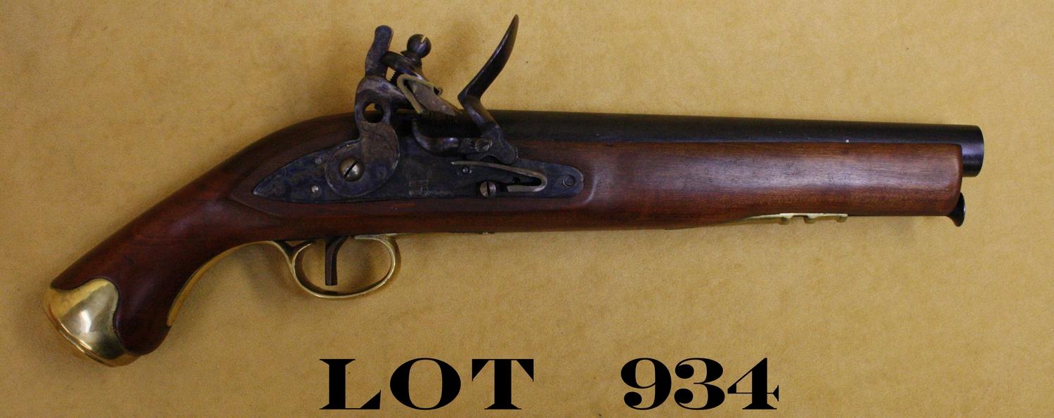 Reproduction flintlock pistol, .69 cal., 9” barrel, blue and case hardened finish, wood stock, brass mountings, #995. This gun is in overall excellent condition showing little handling; in two piece cardboardmanufacturer’s box. Est.: $50-$100.