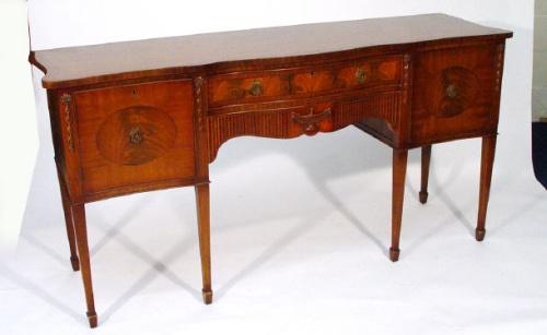 Reproduction line inlaid mahogany serpentine fronted sideboard with urn and floral mouldings, fitted