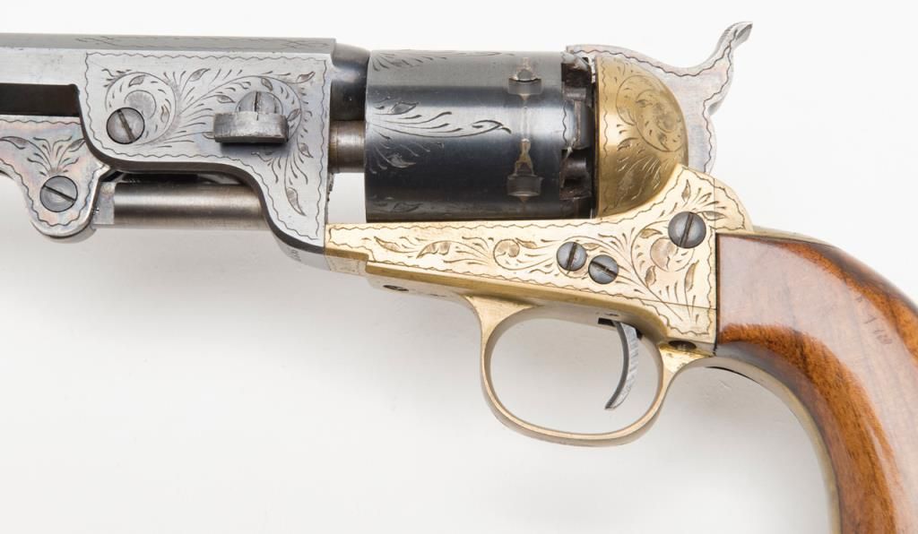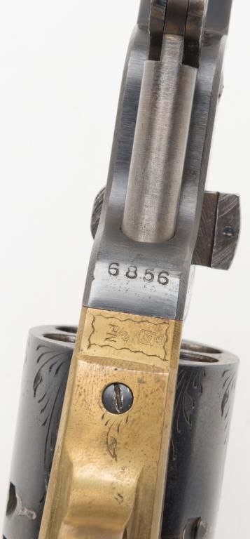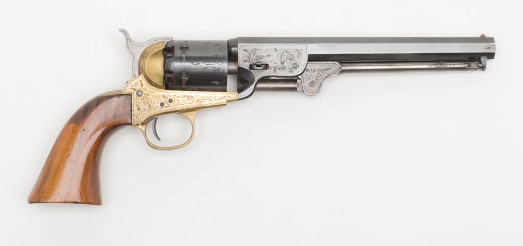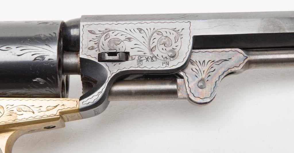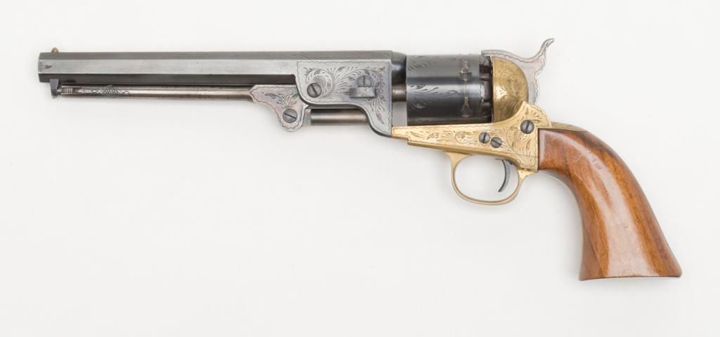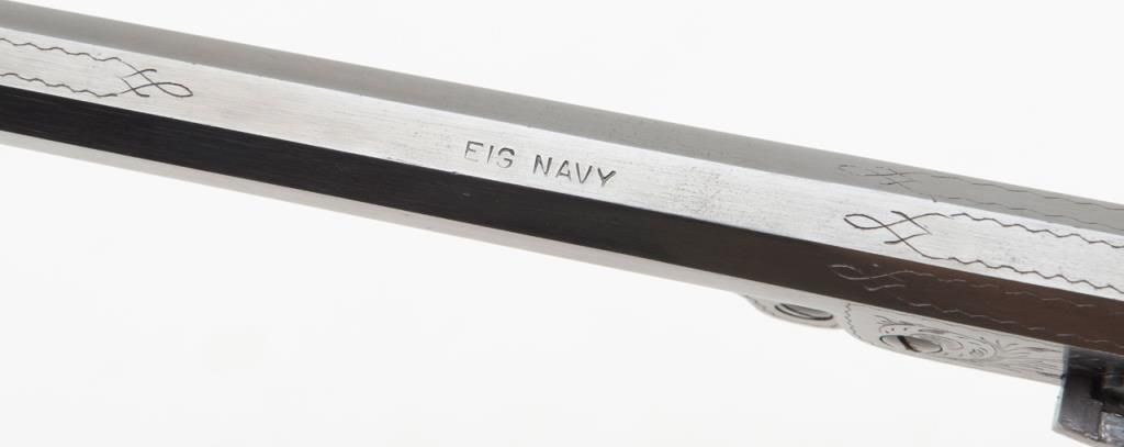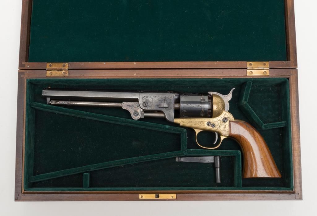 Reproduction of 1851 Navy Colt by E.I.G. (Italy) in .36 caliber percussion with engraved brass frame and display case, serial number 6856. Fine to near excellent condition shows just slight handling no evidence of firing or use Est.:$150-$300