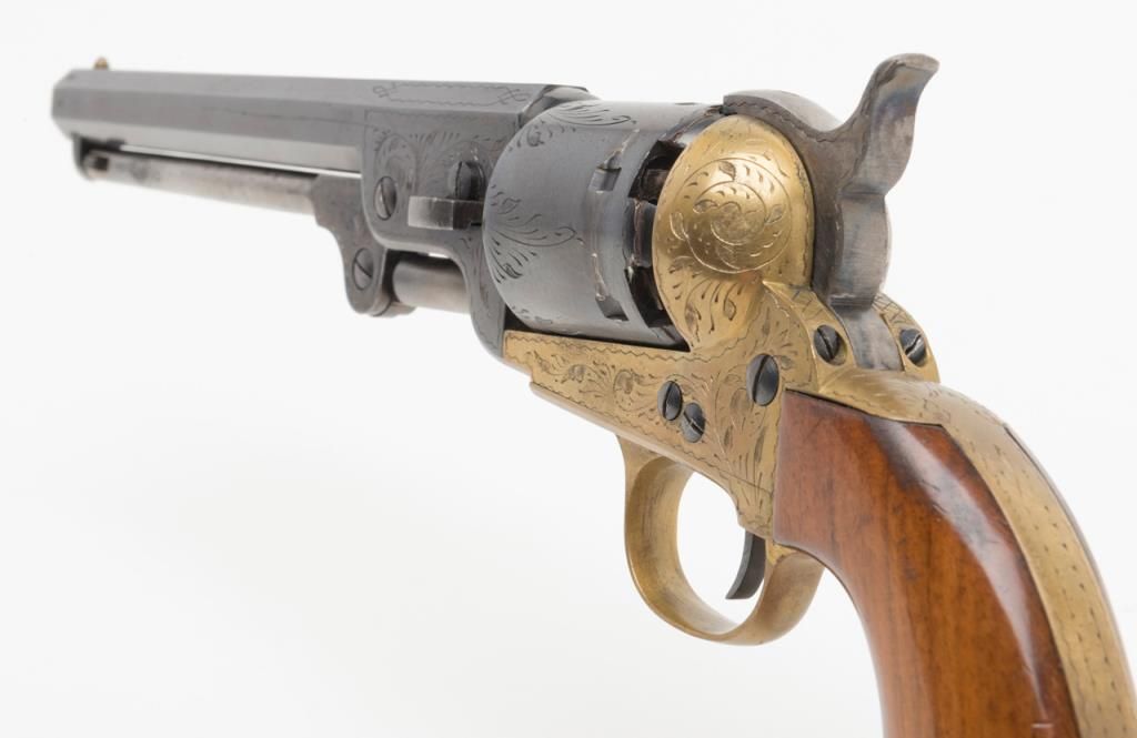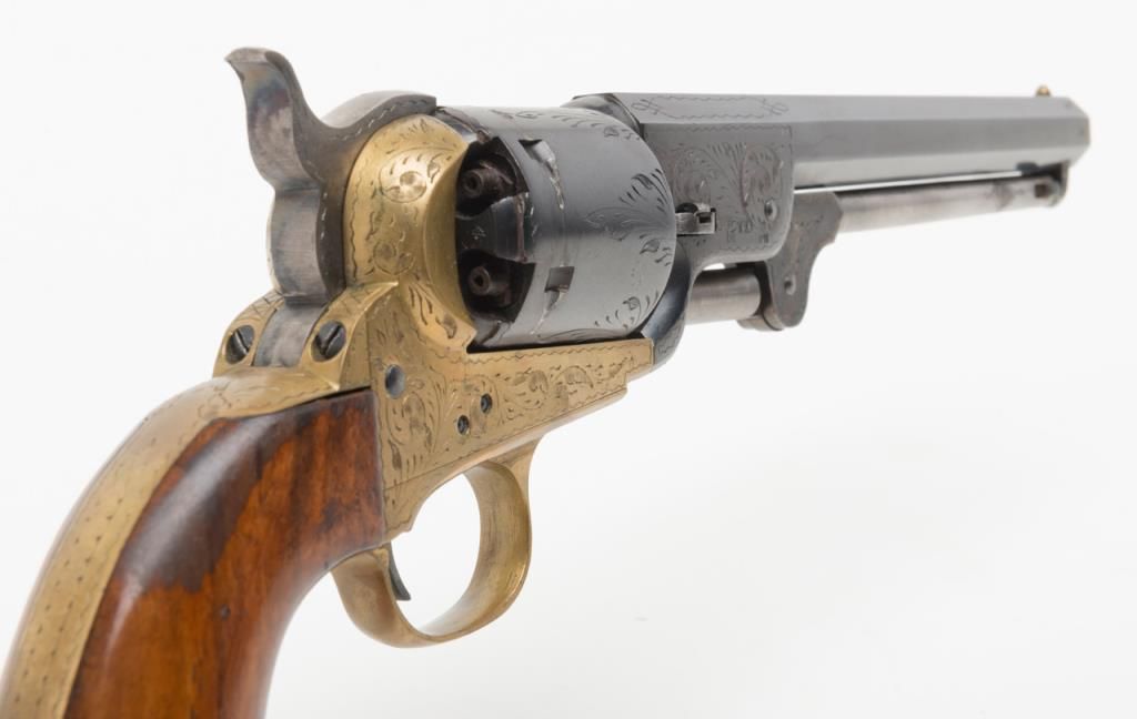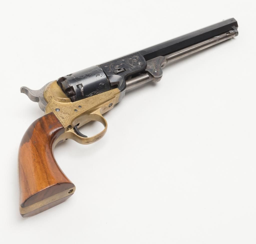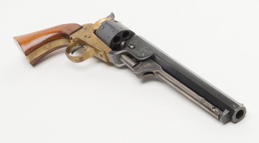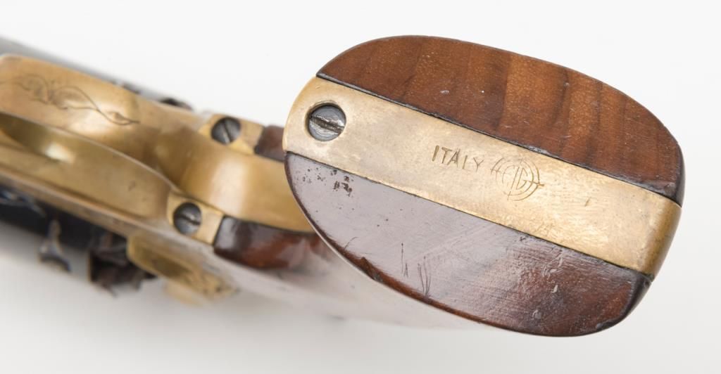 Reproduction of 1851 Navy Colt by E.I.G. (Italy) in .36 caliber percussion with engraved brass frame and display case, serial number 6856. Fine to near excellent condition shows just slight handling no evidence of firing or use Est.:$150-$300