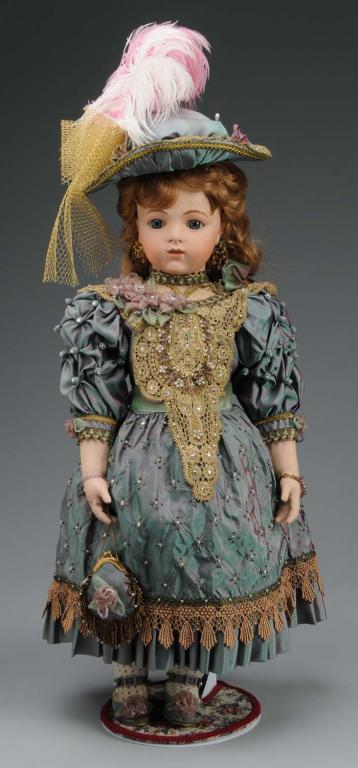 Description Bisque head doll on separate bisque shoulder plate with bisque lower arms and legs. This is a reproduction of the 1880s French Bru Doll signed by artist on back of head but illegible. Condition (Excellent). Size 27" T.