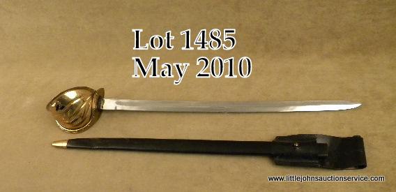 Reproduction of a US Naval Cutlass with leather scabbard and frog; in overall excellent condition, approx. 31” overall with a 25” blade and “USN” cut out brass basket hand guard. Est.: $50-$100.