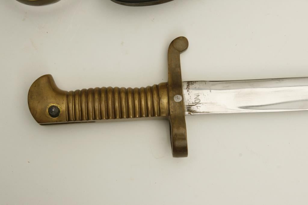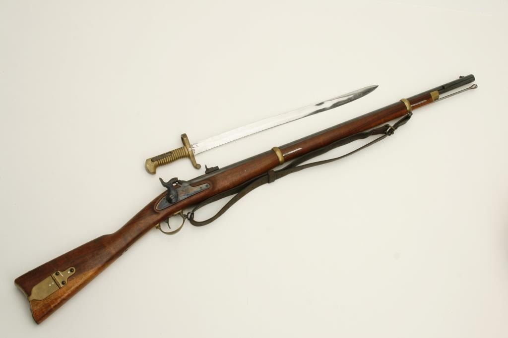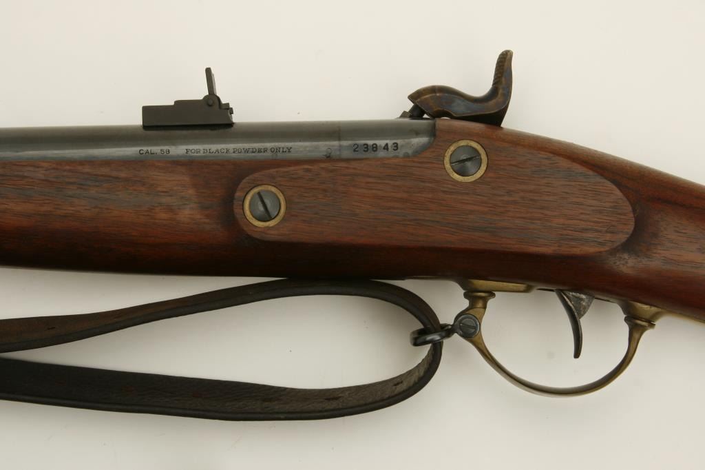 with saber bayonet, .58 caliber, blued and case hardened finish, wood stock, iron ramrod and brass gripped saber bayonet; in overall very good to near fine condition with old leather sling added. (Percussion). Est.: $300-$600.