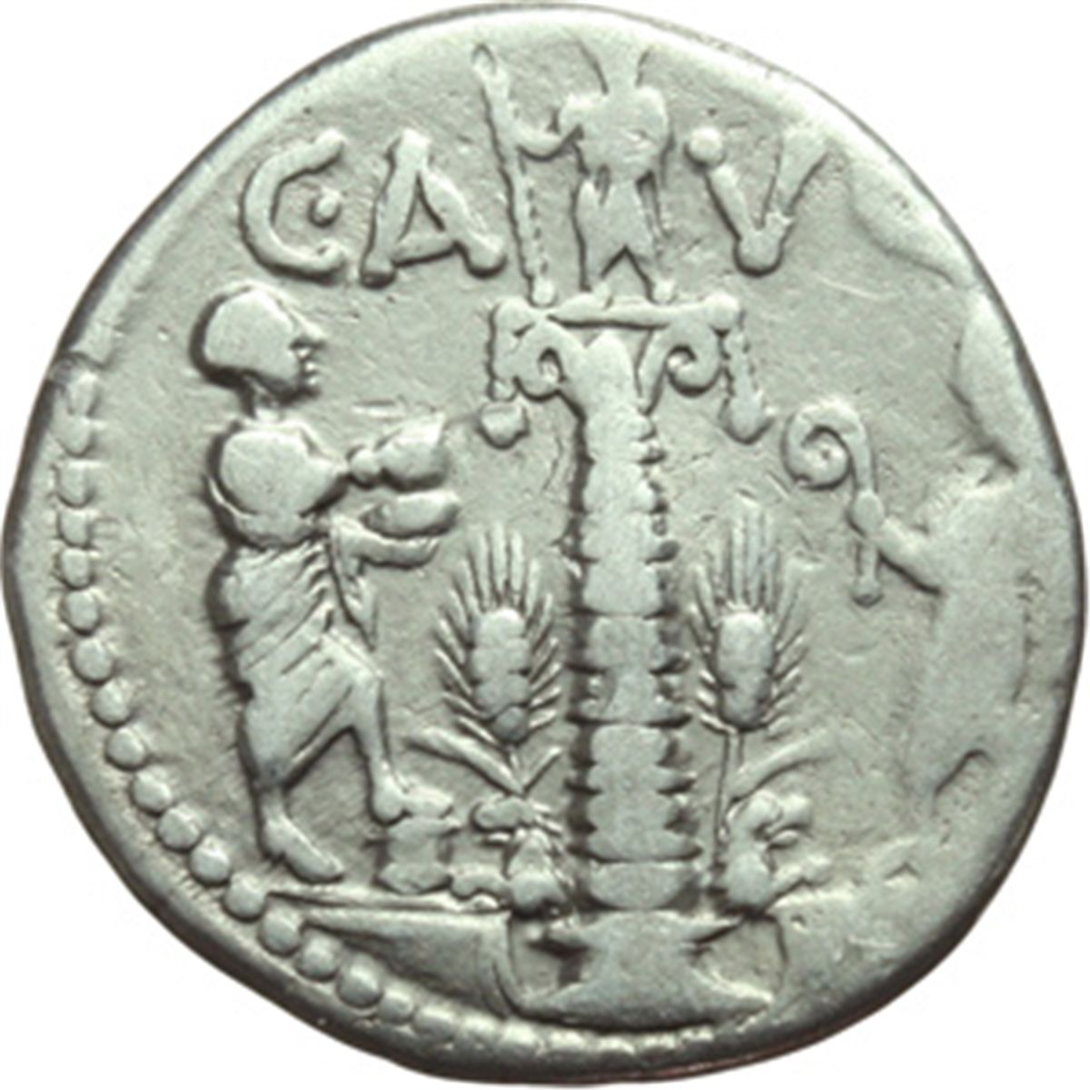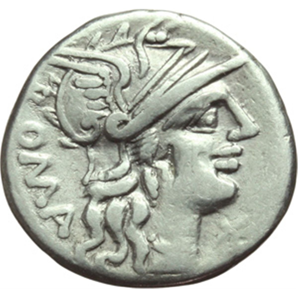 Repubblica Romana. C. Augurinus. Denario, 135 a.C. D/ Testa di Roma a destra. Sotto il mento, X. Dietro, ROMA. R/ C. AVG. Due personaggi togati ai lati di colonna ionica. Cr.242/1. B.(Minucia) 3. AG. g. 3.77 mm. 19.00 BB.