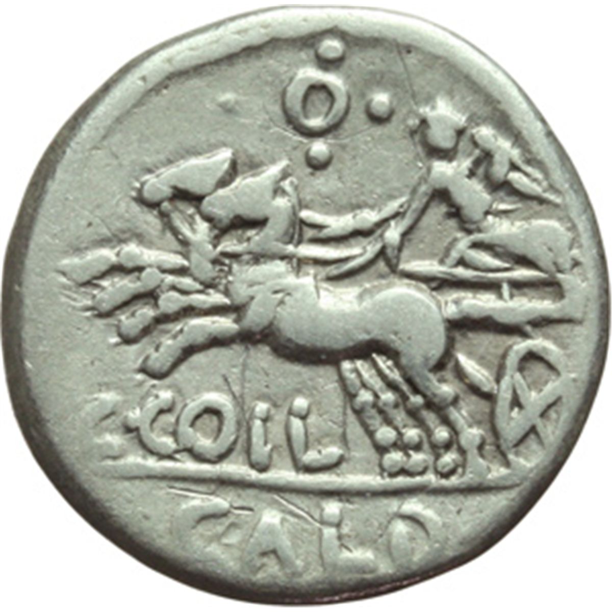Repubblica Romana. C. Coelius Caldus. Denario, 104 a.C. D/ Testa di Roma a sinistra. R/ Vittoria in biga a sinistra. Sopra, O e tre punti. Sotto i cavalli, C. COIL. In esergo: CALD. Cr.318/1a. B.2. AG. g. 3.83 mm. 18.00 BB.