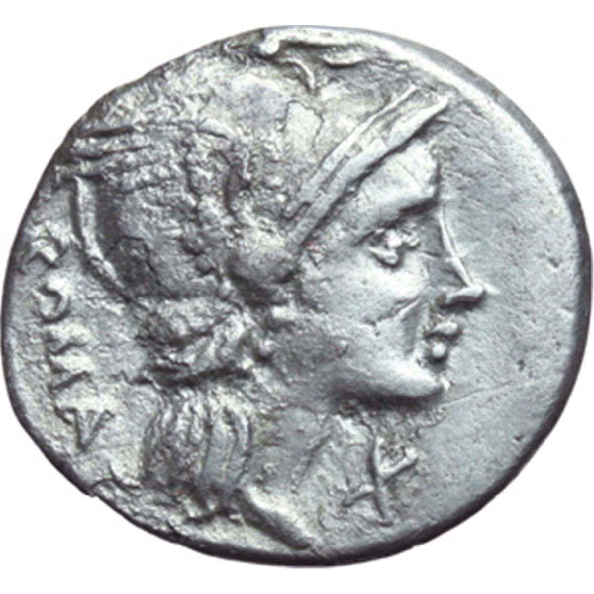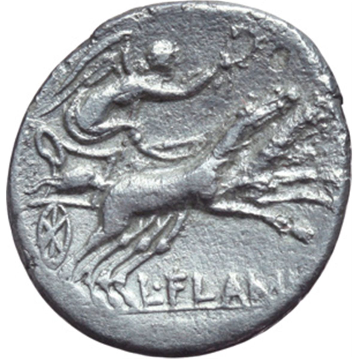 Repubblica Romana. L. Flaminius Chilo. Denario. D/ Testa elmata di Roma a destra. Dietro, ROMA. Sotto il mento, X. R/ Vittoria in biga a destra. Sotto i cavalli, L.FLAMINI. Cr.302/1. AG. g. 3.40 mm. 19.00 MB/qBB.