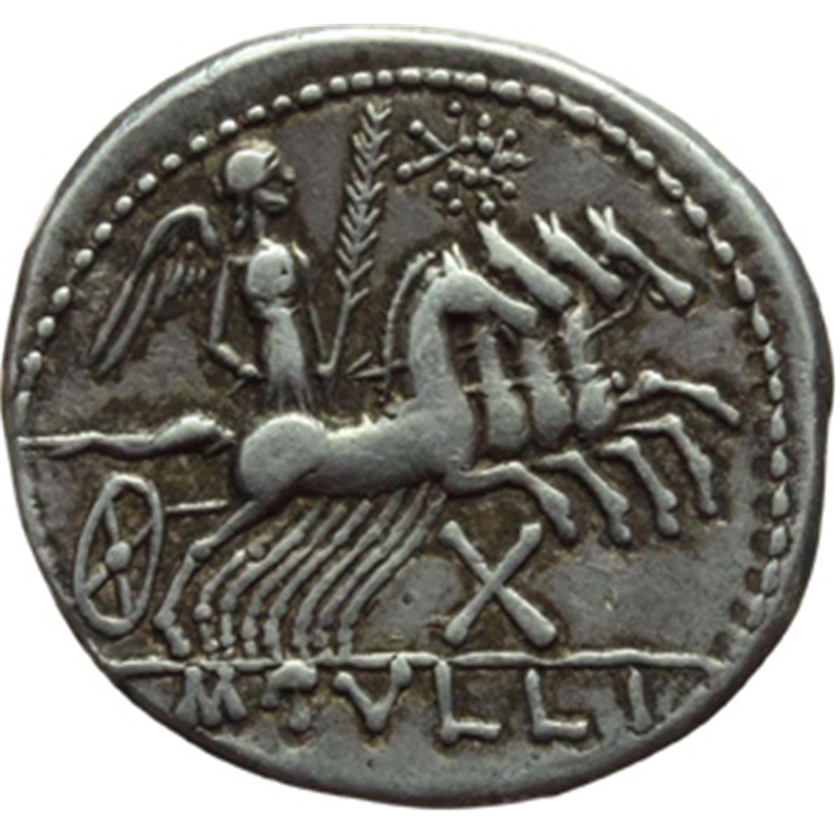 Repubblica Romana. M. Tullius. Denario, 120 a.C. D/ Testa di Roma a destra. Dietro, ROMA. R/ Vittoria in quadriga a destra. Sotto i cavalli, X. Sopra, corona. In esergo: M. TVLLI. Cr. 280/1. B.1. AG. g. 3.96 mm. 21.00 Bel BB+/BB.