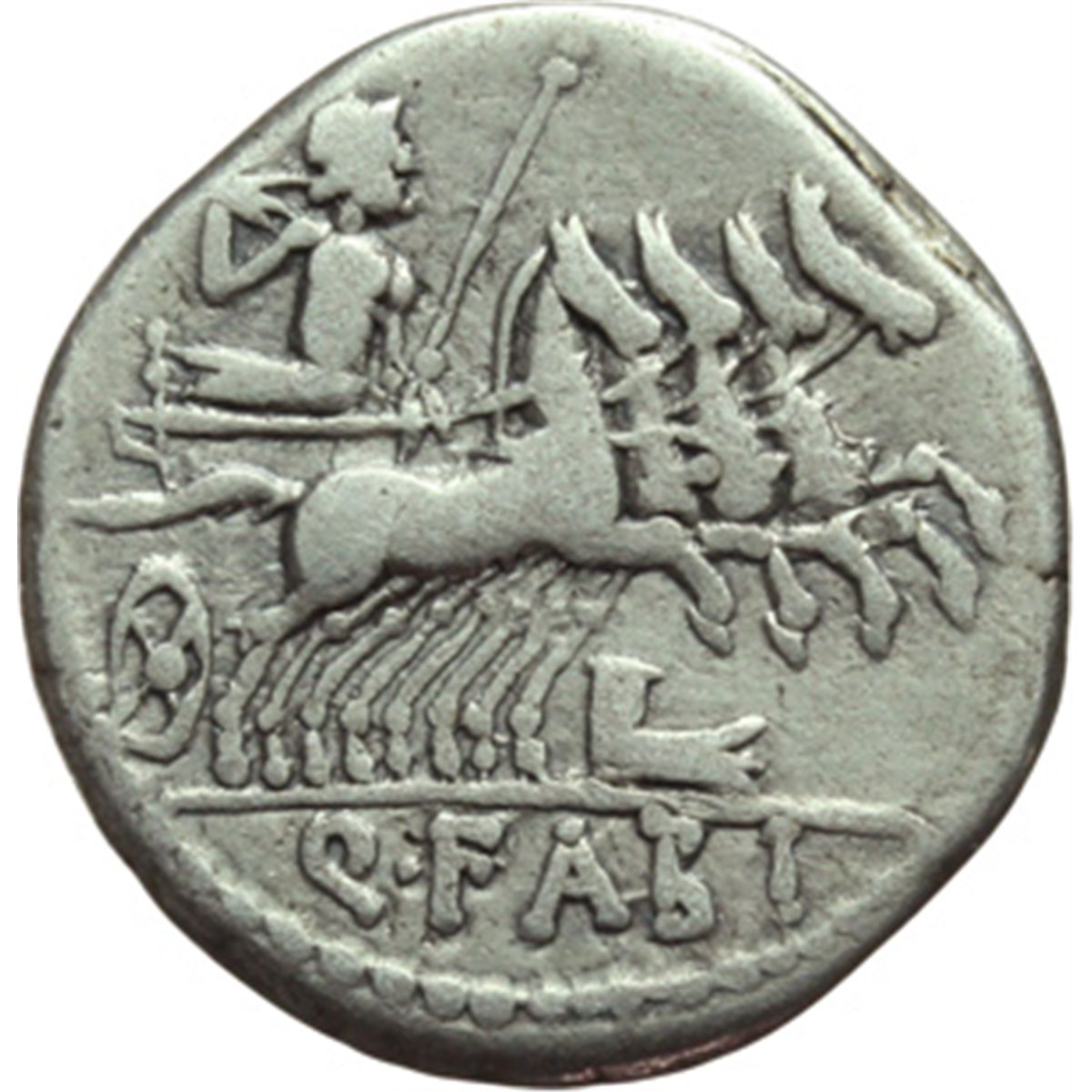 Repubblica Romana. Q. Fabius Labeo. Denario, 124 a.C. D/ Testa di Roma a destra. Davanti, LABEO. Sotto il mento, X. Dietro, ROMA. R/ Jupier in quadriga a destra. Sotto i cavalli, prua. In esergo: Q. FABI. Cr.273/1. B.1. AG. g. 3.77 mm. 18.50 BB.