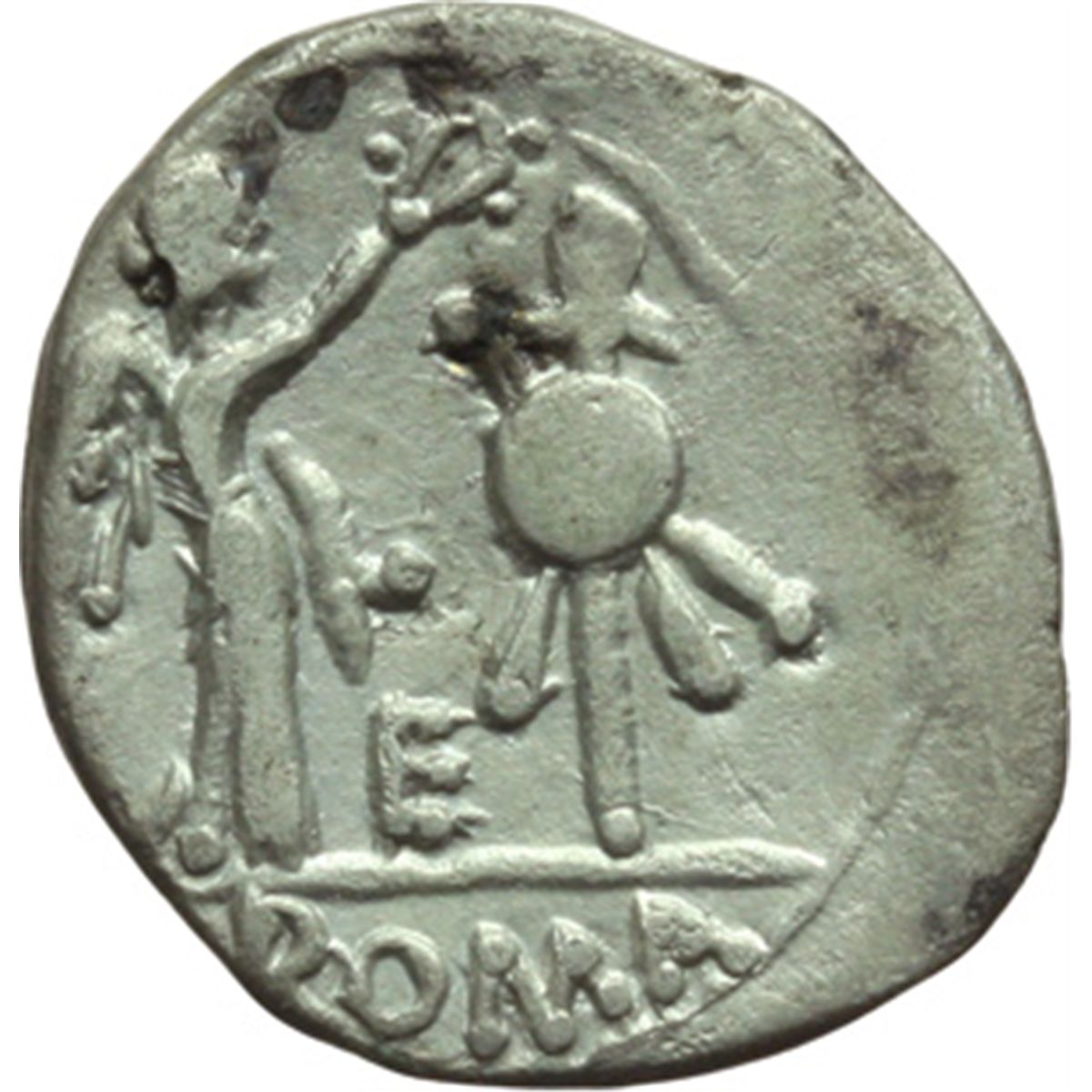 Repubblica Romana. Serie anonima. Quinario, 81 a.C. D/ Testa laureata di Apollo a destra. R/ Vittoria stante a destra incorona un trofeo. Nel campo, E. In esergo: ROMA. Cr.373/1b. AG. g. 1.78 mm. 14.00 BB.