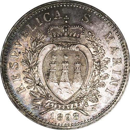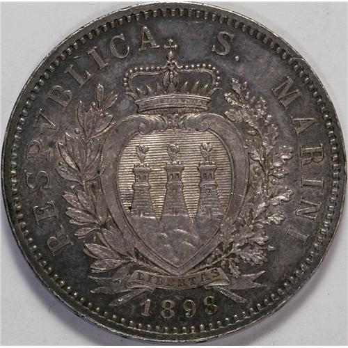 <B>Repubic 5 Lire 1898R, </B></I>KM6, attractively toned AU-UNC, scarce and popular type.