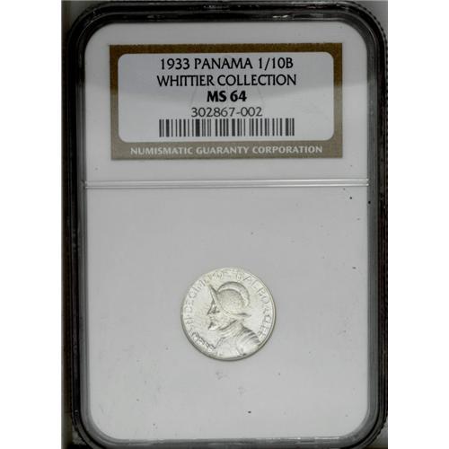 <B>Republic 1/10 Balboa 1933, </B></I>KM10.1, MS64 NGC, a choice example with full brilliant luster, very scarce grade.