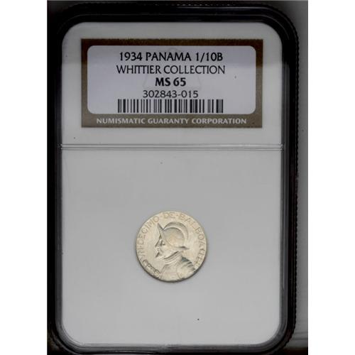 <B>Republic 1/10 Balboa 1934, </B></I>KM10.1, MS65 NGC, rare date in this quality, full mint brilliance and virtually perfect surfaces.