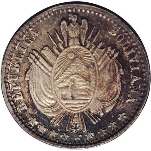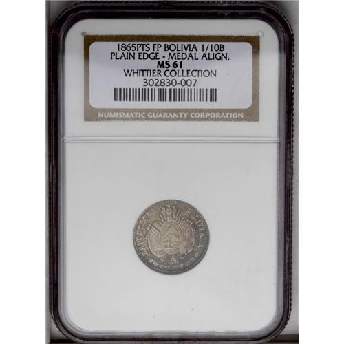 <B>Republic 1/10 Boliviano 1865-FP, </B></I>KM150, MS61 NGC, deeply toned and much nicer than the MS61 designation. Possibly a pattern or trial strike with plain edge and medal alignment.