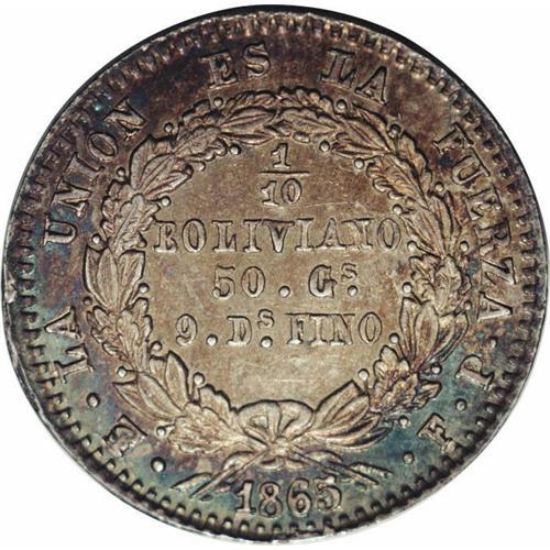 Republic 1/10 Boliviano 1865-FP, KM150, MS61 NGC, deepl Republic 1/10 Boliviano 1865-FP,