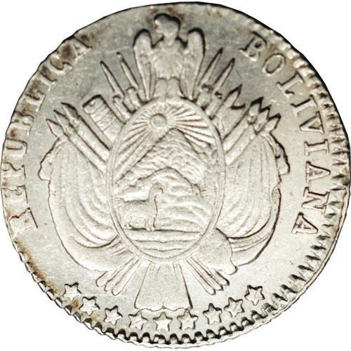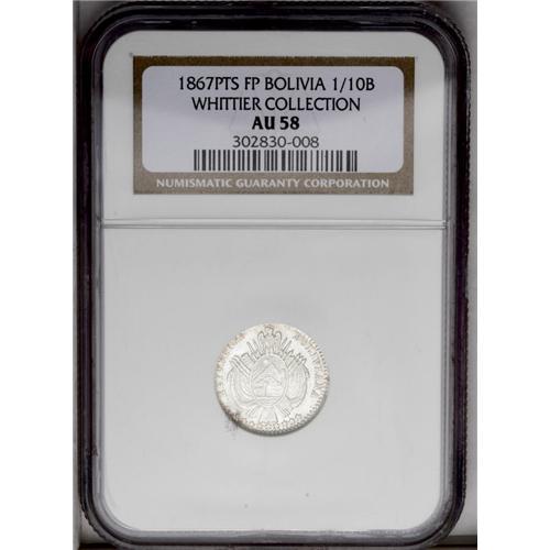 <B>Republic 1/10 Boliviano 1867-FP, </B></I>KM150, AU58 NGC, a lustrous example with very little wear evident. Very rare date in this quality, perhaps the finest known.