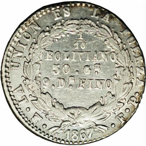 Republic 1/10 Boliviano 1867-FP, KM150, AU58 NGC, a lus Republic 1/10 Boliviano 1867-FP,