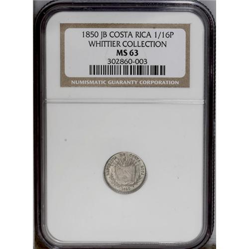 <B>Republic 1/16 Peso 1850-JB, </B></I>KM101, MS63 NGC, a gorgeous little coin with exceptionally bold design details and appealing silver-gray toning. Very rare in this superb quality.