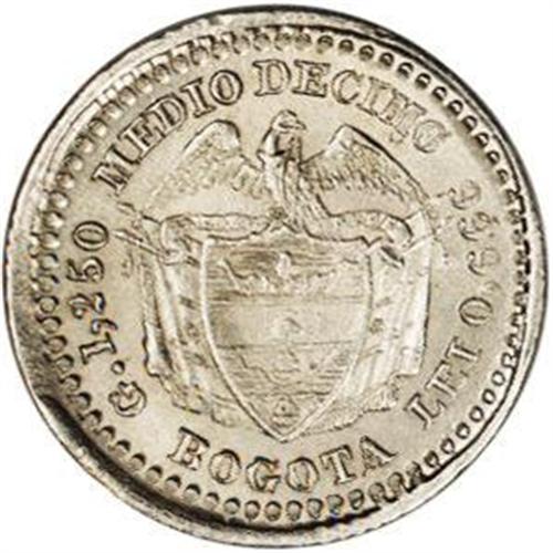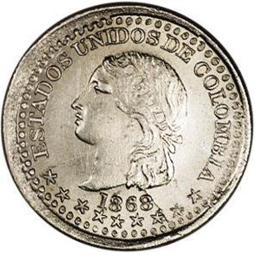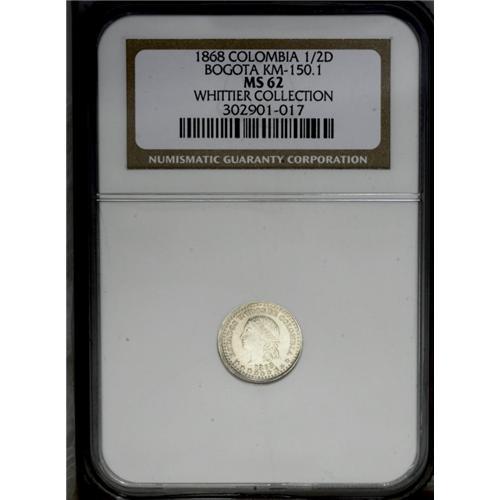 <B>Republic 1/2 Decimo 1868 Bogota, </B></I>KM150.1, MS62 NGC, lustrous and very sharply struck with two interesting obverse die breaks. Perhaps the nicest example extant.