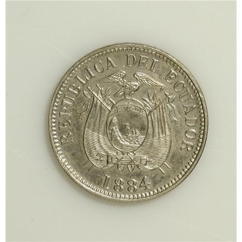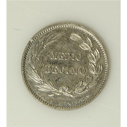 <B>Republic 1/2 Decimo 1884H, </B></I>KM49, prooflike UNC, lightly toned, specimen strike from the Heaton Mint collection.<BR><I>From the Shinholser Collection</B></I><BR><BR><b>Shipping:</b> Coin/Currency (<a target="_blank" href="http://www.heritageauctions.com/common/shipping.php">view shipping information</a>)