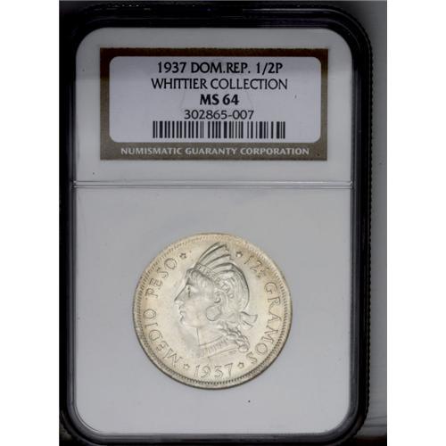 Republic 1/2 Peso 1937, KM21, MS64 NGC, an unusually ch Republic 1/2 Peso 1937,