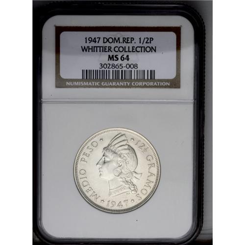 <B>Republic 1/2 Peso 1947, </B></I>KM21, MS64 NGC, an extremely attractive coin with fabulous mint luster and unusually blemish-free surfaces. Very rare date in this premium quality.