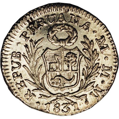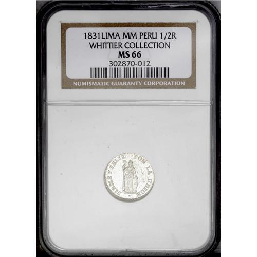 <B>Republic 1/2 Real 1831-MM Lima, </B></I>KM144.1, MS66 NGC, a premium coin with full intense mint luster and very bold design details. Rare in this lofty designation!