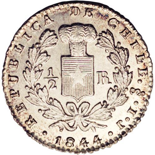<B>Republic 1/2 Real 1844-IJ, </B></I>KM98.2, MS67 NGC, a magnificent little coin, possibly one of the finest grades in the entire Whittier Collection. The strike is perfect, the luster is intense and the emerging toning is an artistic complement to the overall appeal of the coin. Third issue with reduced diameter.