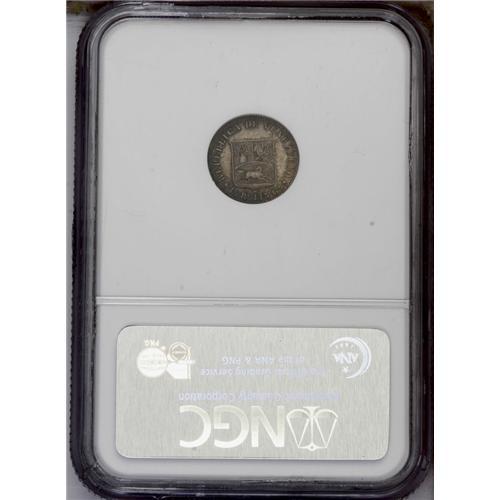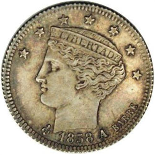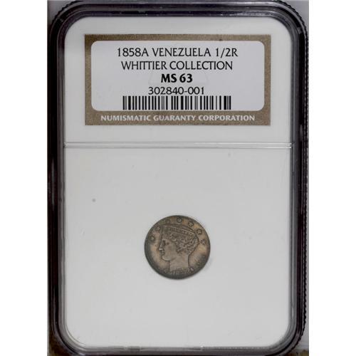 <B>Republic 1/2 Real 1858A, </B></I>KM-Y8, MS63 NGC, a superb little coin with exceptionally sharp details and dramatic deep gray and gold patina. Extremely rare in this quality and even more elusive as a completely original piece with that old-time numismatic cabinet feel.
