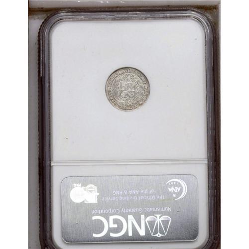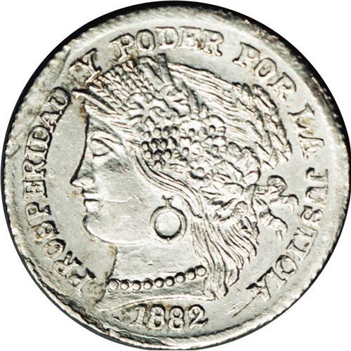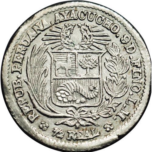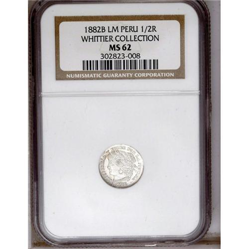 <B>Republic 1/2 Real 1882-LM Ayacucho, </B></I>KM202, MS62 NGC, exceptionally sharp details and full mint luster, an incredibly rare type coin in this grade. Most examples of this type have been holed or used in jewelry.