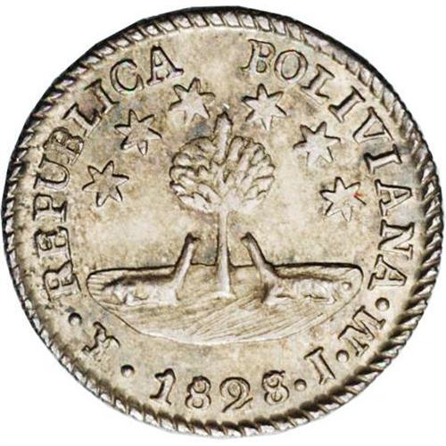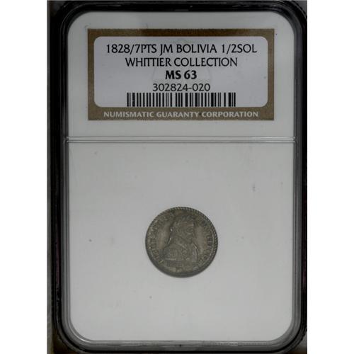 <B>Republic 1/2 Sol 1828/7-JM, </B></I>KM93.1, MS63 NGC, deeply toned and very attractive, bold overdate. Legend ends in TUCI.