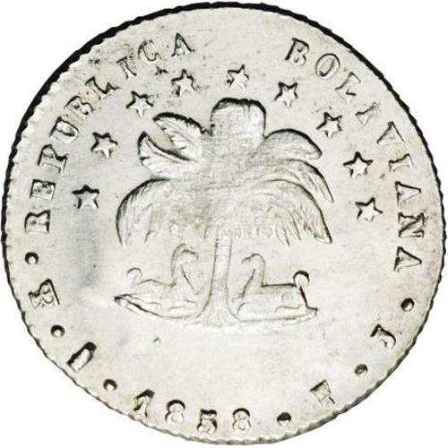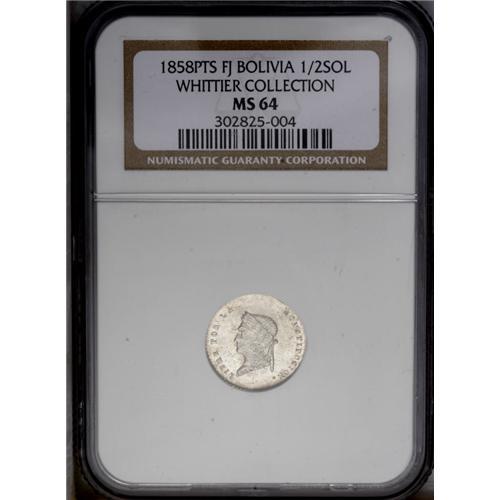 <B>Republic 1/2 Sol 1858-FJ, </B></I>KM118.2, MS64 NGC, fully brilliant, slightly crude die state on the bust.