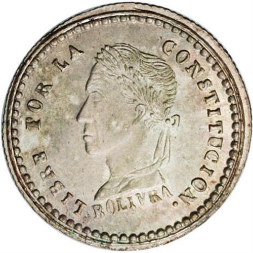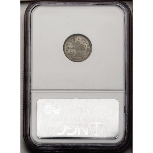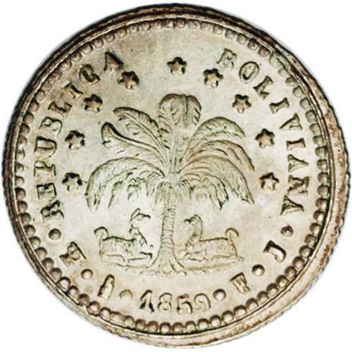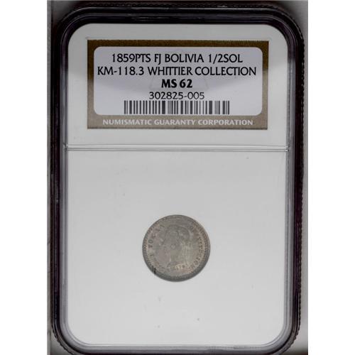 <B>Republic 1/2 Sol 1859-FJ, </B></I>KM118.3, MS62 NGC, nicely toned and the SCWC plate coin, rare variety with error spelling BOLIVRA below the bust.
