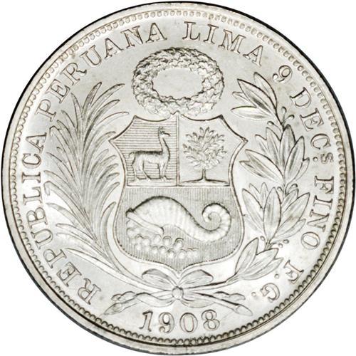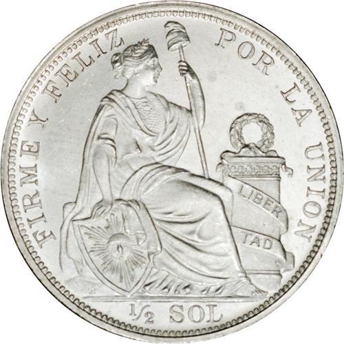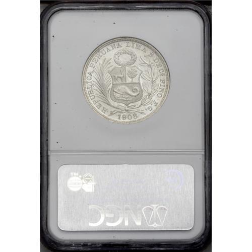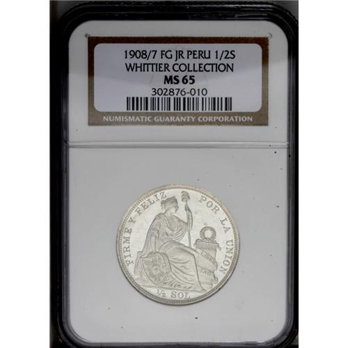 <B>Republic 1/2 Sol 1908/7-FG-JR, </B></I>KM203, MS65 NGC, a choice example of this rare date with full white mint brilliance.