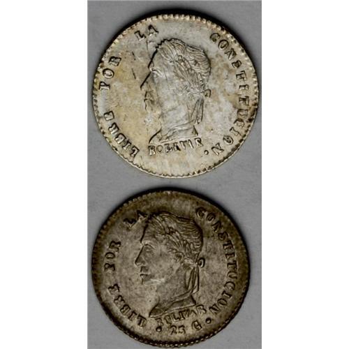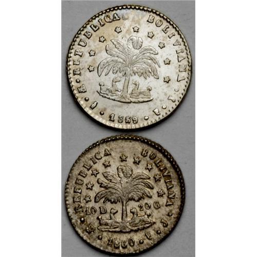 <B>Republic 1/2 Sol - Choice Pair, </B></I>KM118.3 1859-FJ, scarce date, nice XF-AU, light flan flaw, and KM133.2 1860-FJ, toned UNC, very attractive.