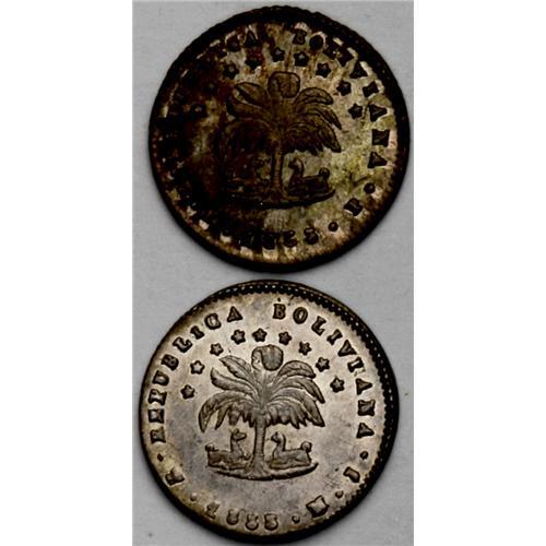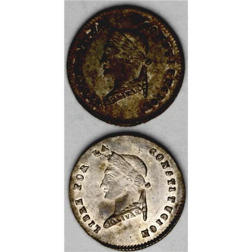 <B>Republic 1/2 Sol - Two Dates, </B></I>KM118.1, 1853-FP, superb toned UNC, scarce date and unlisted variety with C/S in Constitucion (first C) and 1855-MJ, lightly toned UNC with abundant mint luster. Early type without denomination.