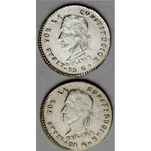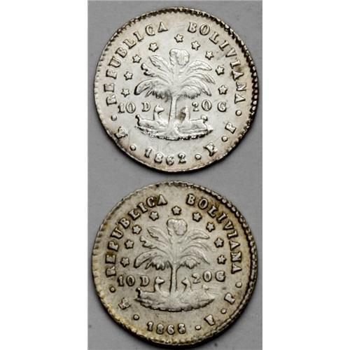 <B>Republic 1/2 Sol - Two Dates, </B></I>KM133.2, 1862-FP, brilliant UNC, few very vague scratches, and 1863-FP, VF+.