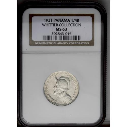 <B>Republic 1/4 Balboa 1931, </B></I>KM11.1, MS63 NGC, a choice fully lustrous example, very appealing. This date in true mint state is one of the great rarities of the entire Panama series.