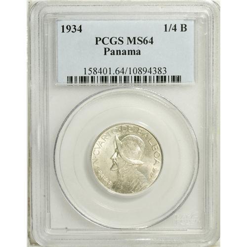 <B>Republic 1/4 Balboa 1934, </B></I>KM11.1, MS64 PCGS, fully brilliant with strong details on the helmet and eagle's breast feathers. Scarce date in this quality.<BR><BR><b>Shipping:</b> Coin/Currency (<a target="_blank" href="http://www.heritageauctions.com/common/shipping.php">view shipping information</a>)