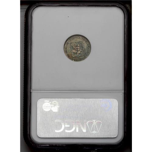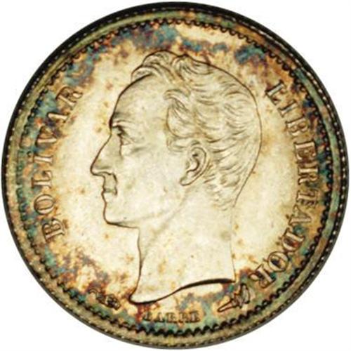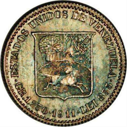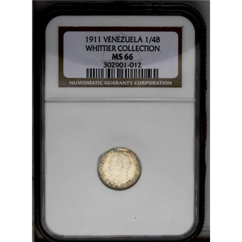 <B>Republic 1/4 Bolivar 1911, </B></I>KM-Y20, MS66 NGC, a superb example with full mint brilliance blending with splendid blue, green and gold patina. Rare and desirable quality!