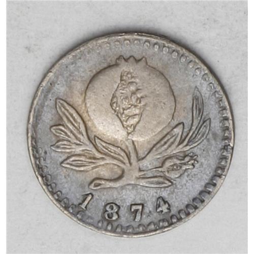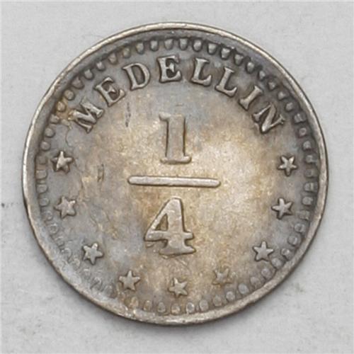 <B>Republic 1/4 Decimo 1874 Medellin, </B></I>KM143.3, toned XF, sharp details, very distinctive style.