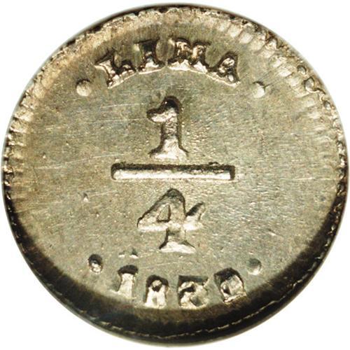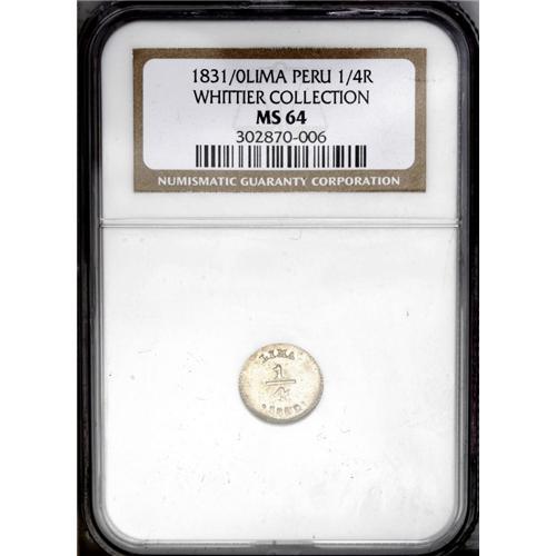 <B>Republic 1/4 Real 1831/0 Lima, </B></I>KM143.1, MS64 NGC, extremely bold details and full mint luster, very scarce grade.